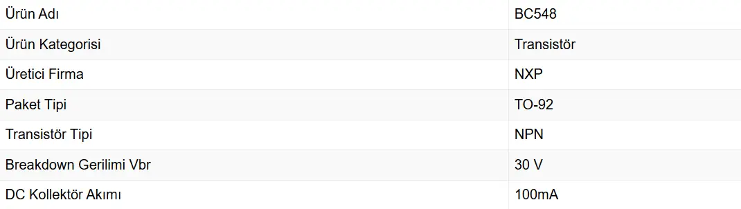 BC548, BC Transistör Serisinde olup TO-92 kılıftadır. BC548, BJT NPN tipi bir Transistördür. BC548 Transistör, 100mA kollektör akımına sahip olup 30V'luk Kollektör-Emiter gerilimine sahiptir.
