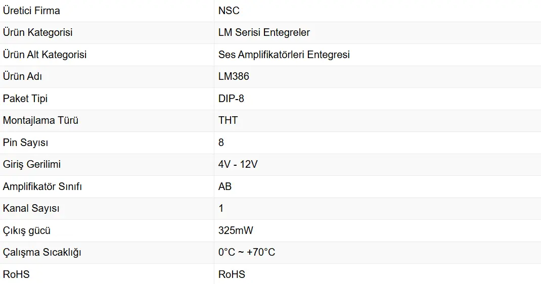 LM386 ses amplifikatörleri entegresi Dip-8 kılıfta olup 1 kanallı bir ses amplifikatörleri entegresidir. LM386 ses amplifikatörleri entegresi AB sınıfı amplifikatör tasarımına sahiptir ve genellikle AM-FM radyo, taşınabilir teyp oynatıcı ve Tv ses sistemleri gibi alanlarda tercih edilir.