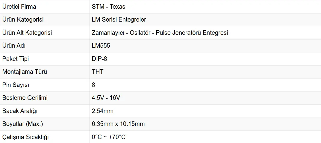 LM555 zamanlayıcı entegresi DIP-8 kılıftadır. 4.5V-16V arasında besleme gerilimi ile çalışır.