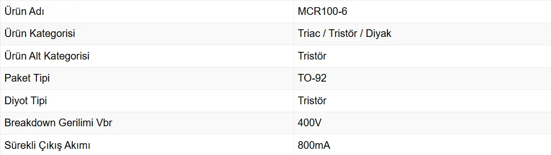 MCR100-6, silisyum kontrollü doğrultucu tipi bir Tristör olup TO-92 kılıftadır.Tristör kategorisinde bulunan MCR100-6, 400V Breakdown Gerilimine sahiptir.MCR100-6 Tristör, 800mA sürekli çıkış akımına sahiptir.